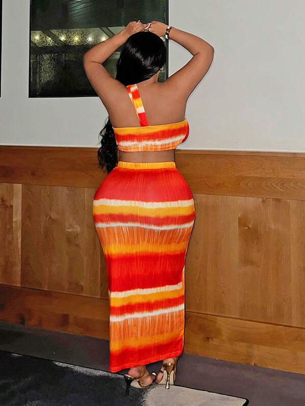 Casual Printed One Shoulder Vest And Hip Skirt Set