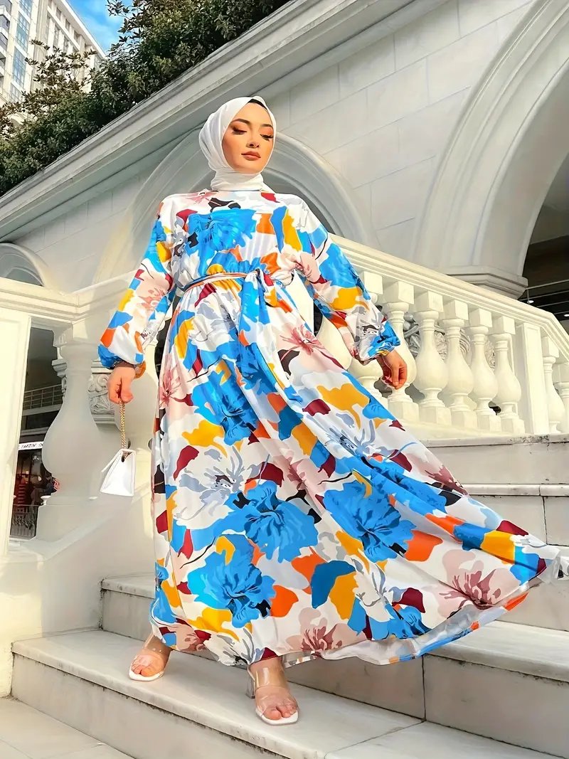 Floral Print Crew Neck Kaftan Abayas Lantern Sleeve Belted Dress