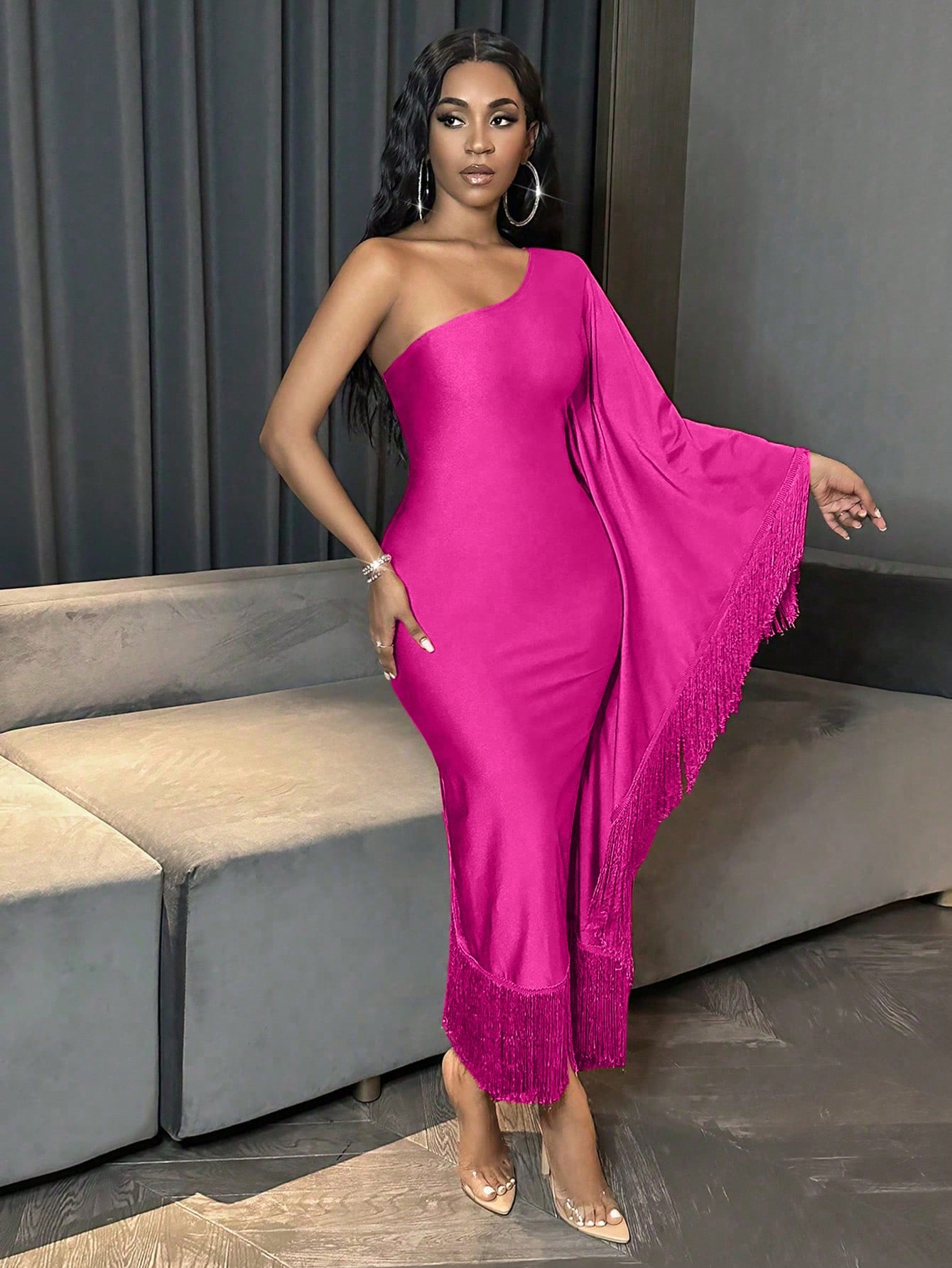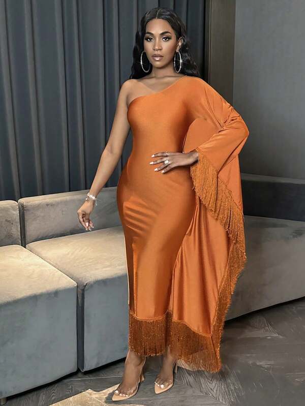 Fringed Asymmetric Collar Bat Sleeve Dress