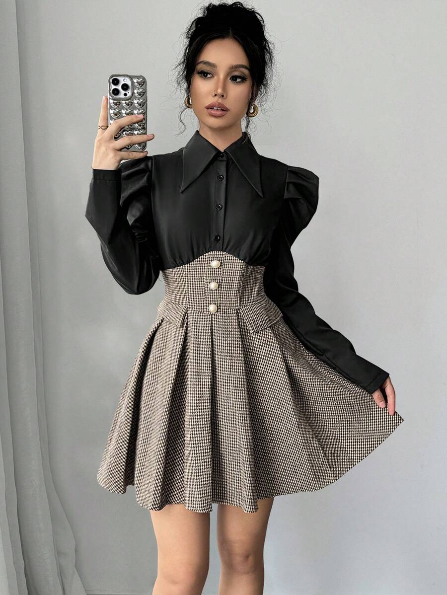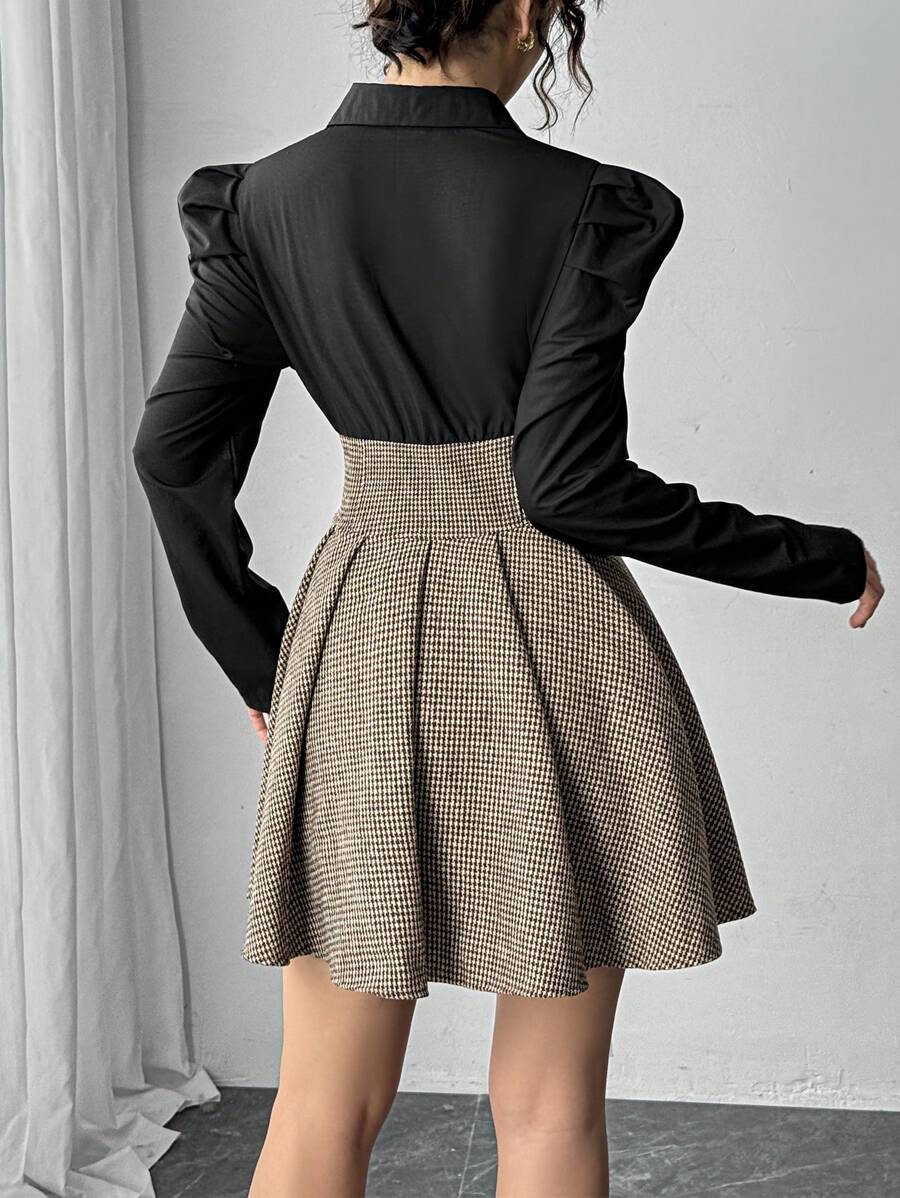 Fruisan Plaid Gigot Sleeve Ruffle Hem Mini Dress