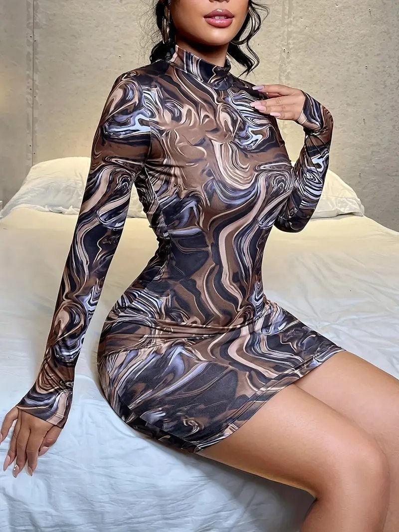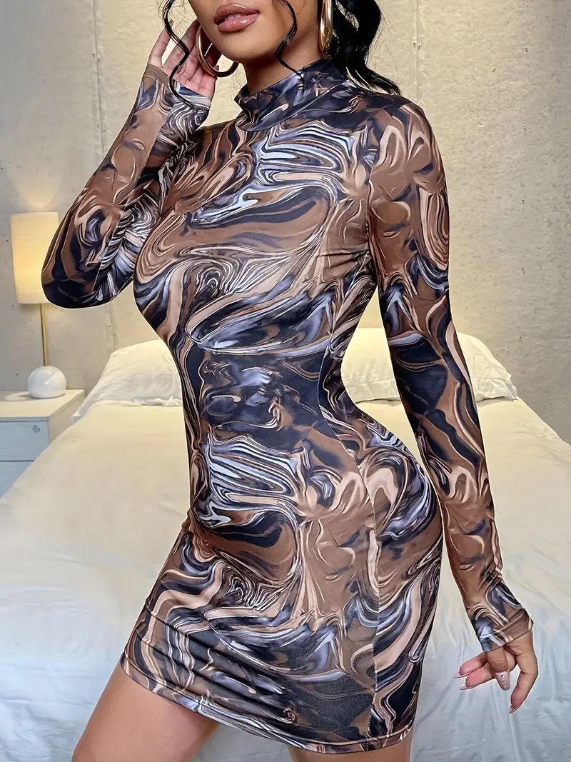Marble Print Mock Neck Bodycon Dress, Y2K Long Sleeve Club Dress