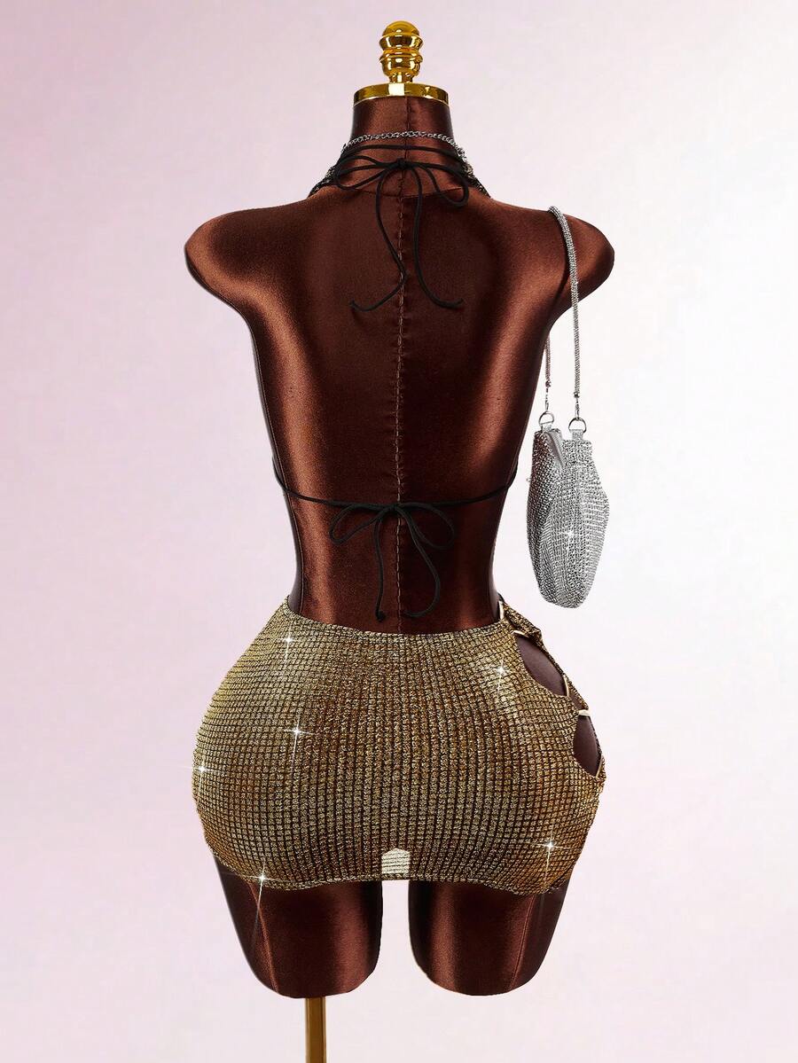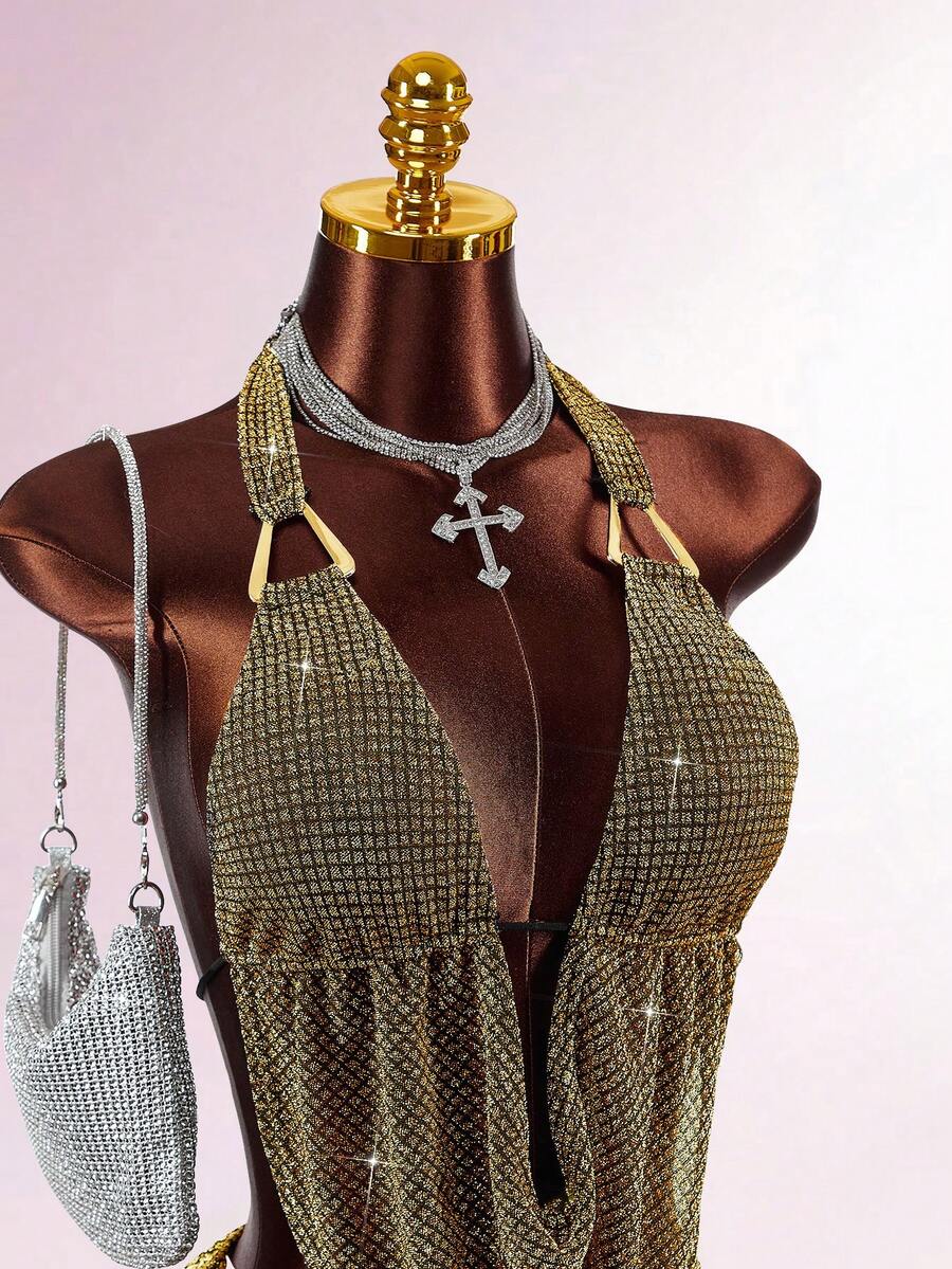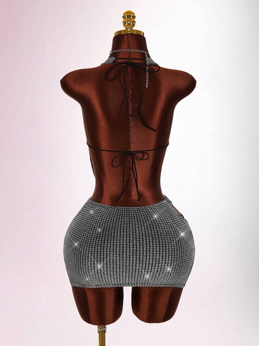 Plunging Neck Glitter Halter Top And Bodycon Mini Skirt 2-Piece Set