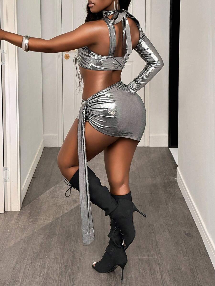 1 review for Sexy Metallic Fabric Halter Hollow-Out Bodycon Mini Dress
