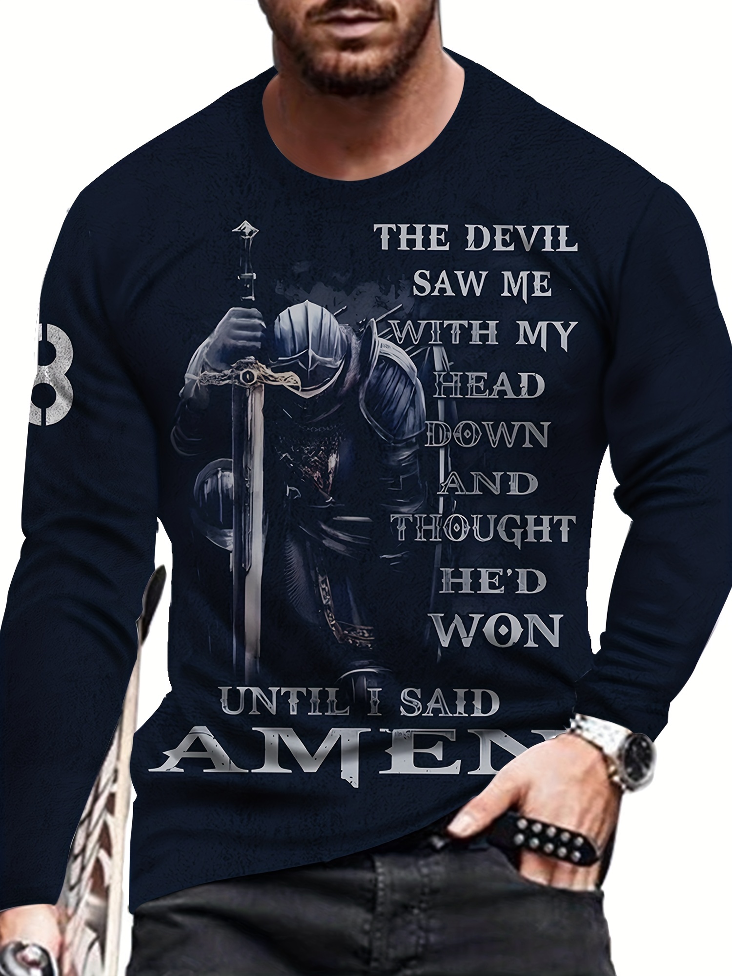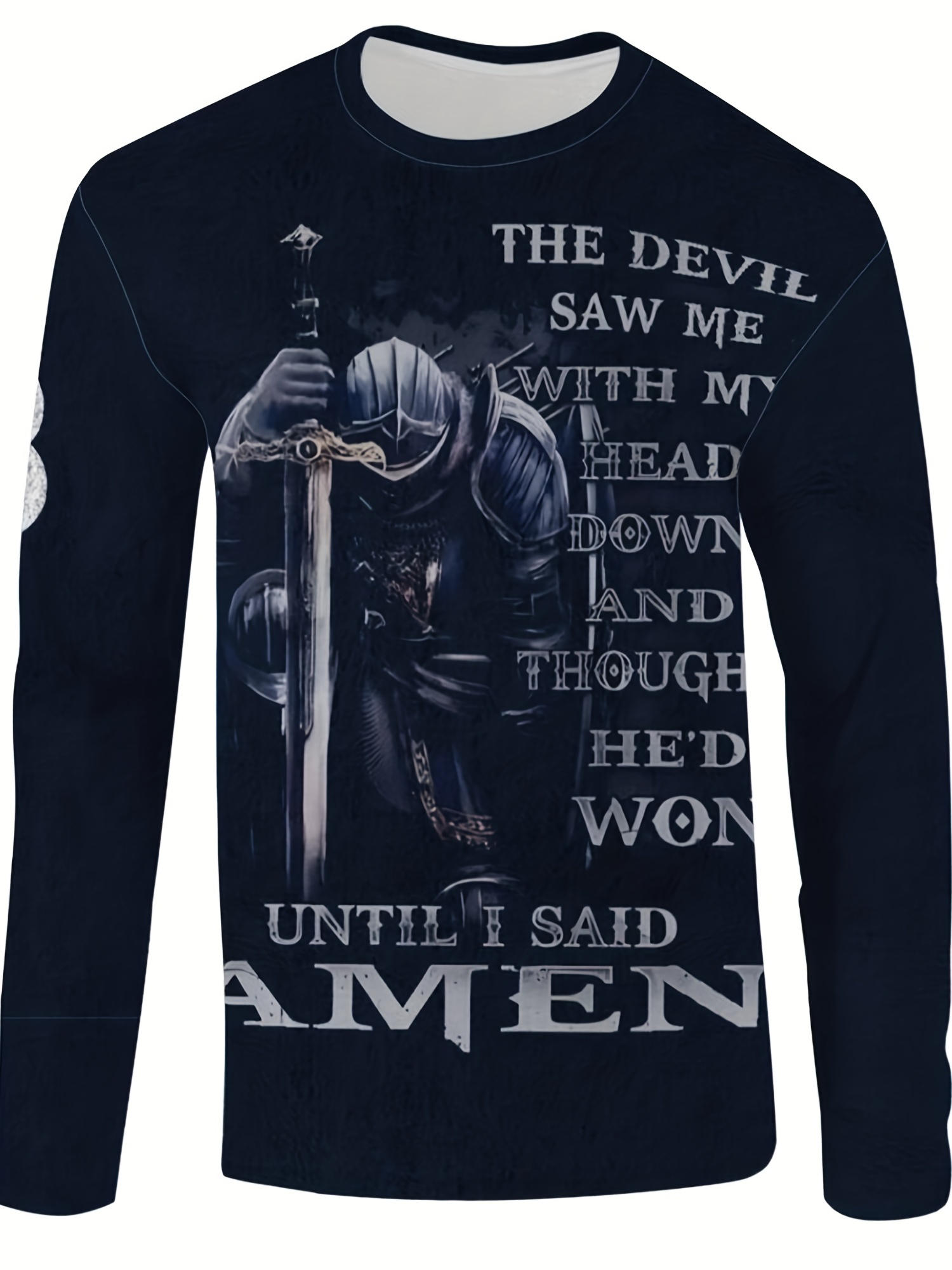 Warrior & Letter Print Men’s Retro Style Long Sleeve Crew Neck T-shirt